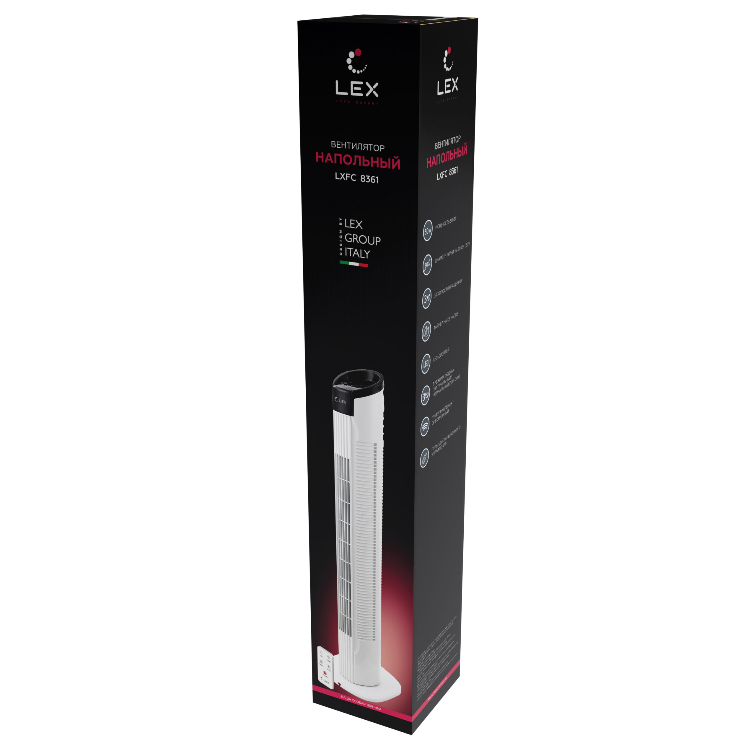 Компактный вентилятор колонного типа, высотою 80 см LXFC 8360 подойдет как для дома, офиса, так и для дачи. Удобное и простое управление с пультом ДУ, устойчивое основание, отличная мощность 50 Вт – что еще надо, чтобы насладиться прохладным ветерком в знойный день? Встроенный таймер с диапазоном от 0,5 до 7,5 часов в сочетании с 3 скоростными режимами скорости и 3 авторежимами, позволят настраивать максимально комфортные время и степень охлаждения помещений. Для более равномерного распределения воздушных потоков предусмотрен механизм поворота корпуса на 90 градусов. Если вы боитесь простудиться под кондиционером, напольный вентилятор колонного типа — лучший вариант. Для удобства переноски модель имеет встроенную ручку.