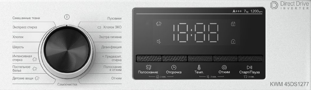 Электронное управление с LED-дисплеем помогает легко и быстро выбрать подходящую программу стирки. Мотор инверторный с прямым приводом. Предусмотрено 15 режимов, которые помогают эффективно ухаживать за различными типами тканей, включая хлопок, смешанные ткани, шерсть и даже пуховики. Отдельно стоит отметить наличие функции стирки с паром, которая позволяет бережно обновить одежду, удаляя запахи и разглаживая мелкие складки. Кроме того, есть возможность отложенного старта до 24 часов.