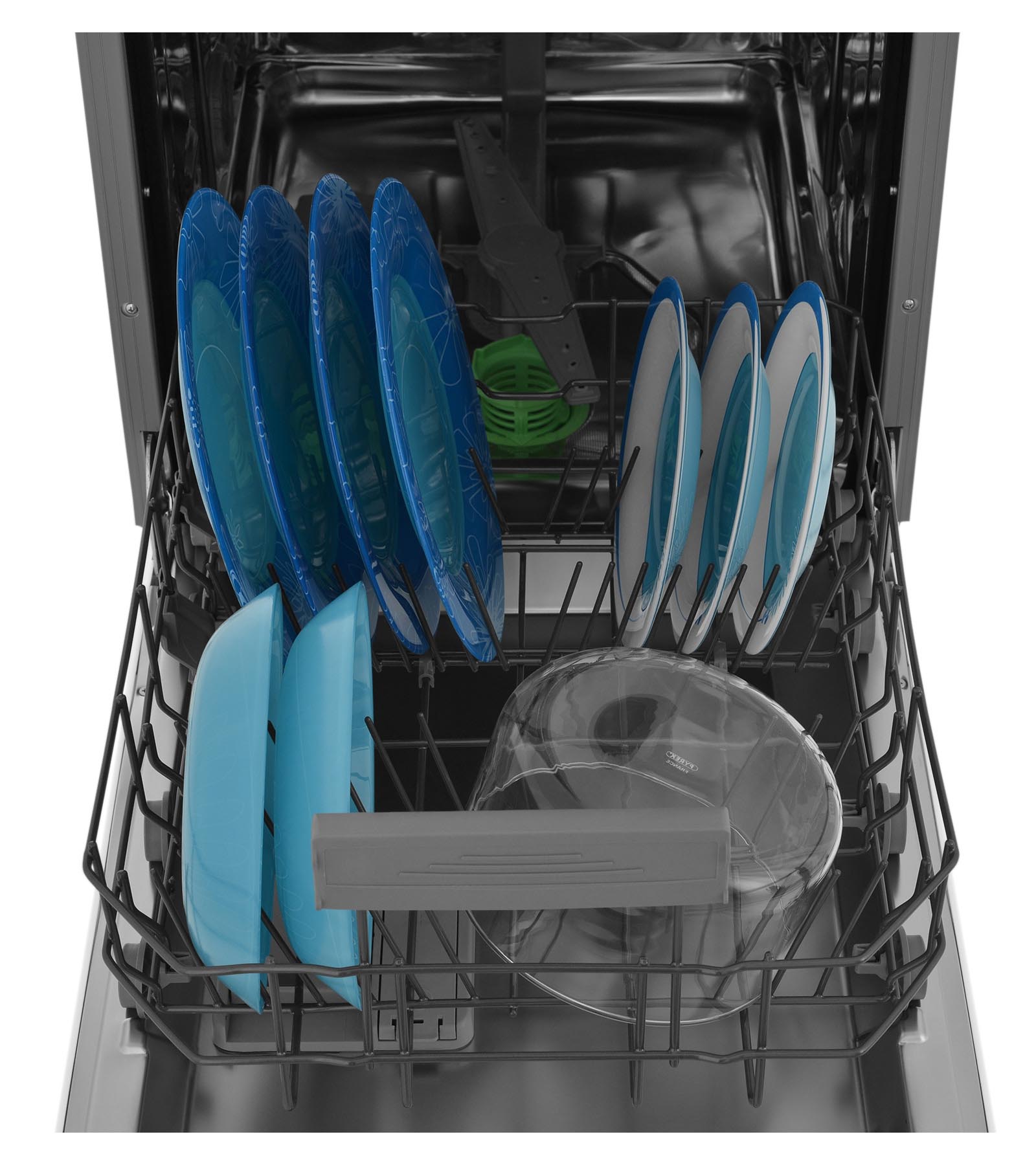 Верхняя корзина регулируется по высоте, а сами корзины в сером цвете, также есть направляющие для тарелок в верхней и нижней корзине.