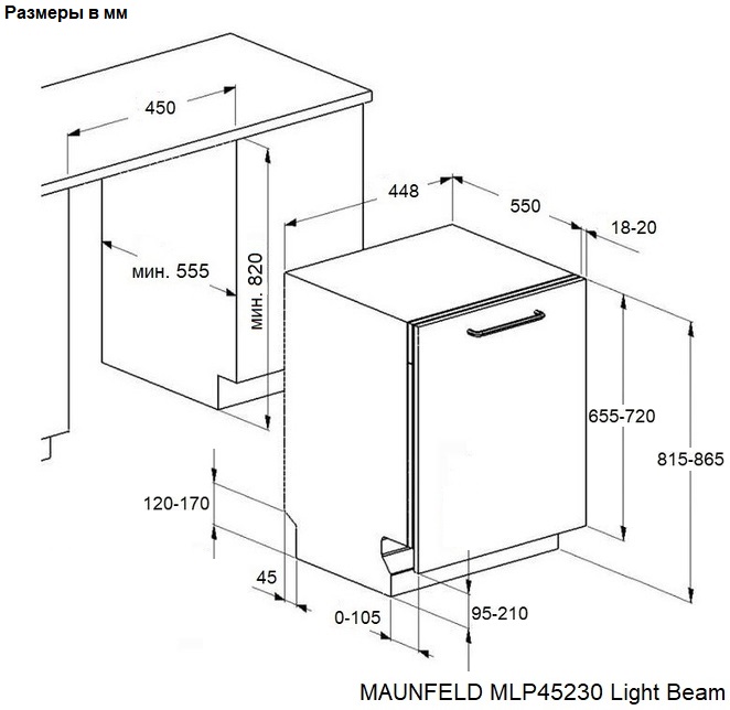 Посудомоечная машина Maunfeld MLP45230 Light Beam - это современное и функциональное устройство, которое станет незаменимым помощником на вашей кухне. Машина полностью встроиваемая, что позволяет гармонично вписать ее в любой интерьер. Благодаря своим компактным размерам (высота 81.5 см, ширина 44.8 см, глубина 55 см), она занимает минимум места на кухне, но в то же время способна помыть до 10 комплектов посуды за один цикл.