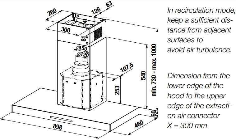 Мин. расположение над газовой варочной панелью, мм 750