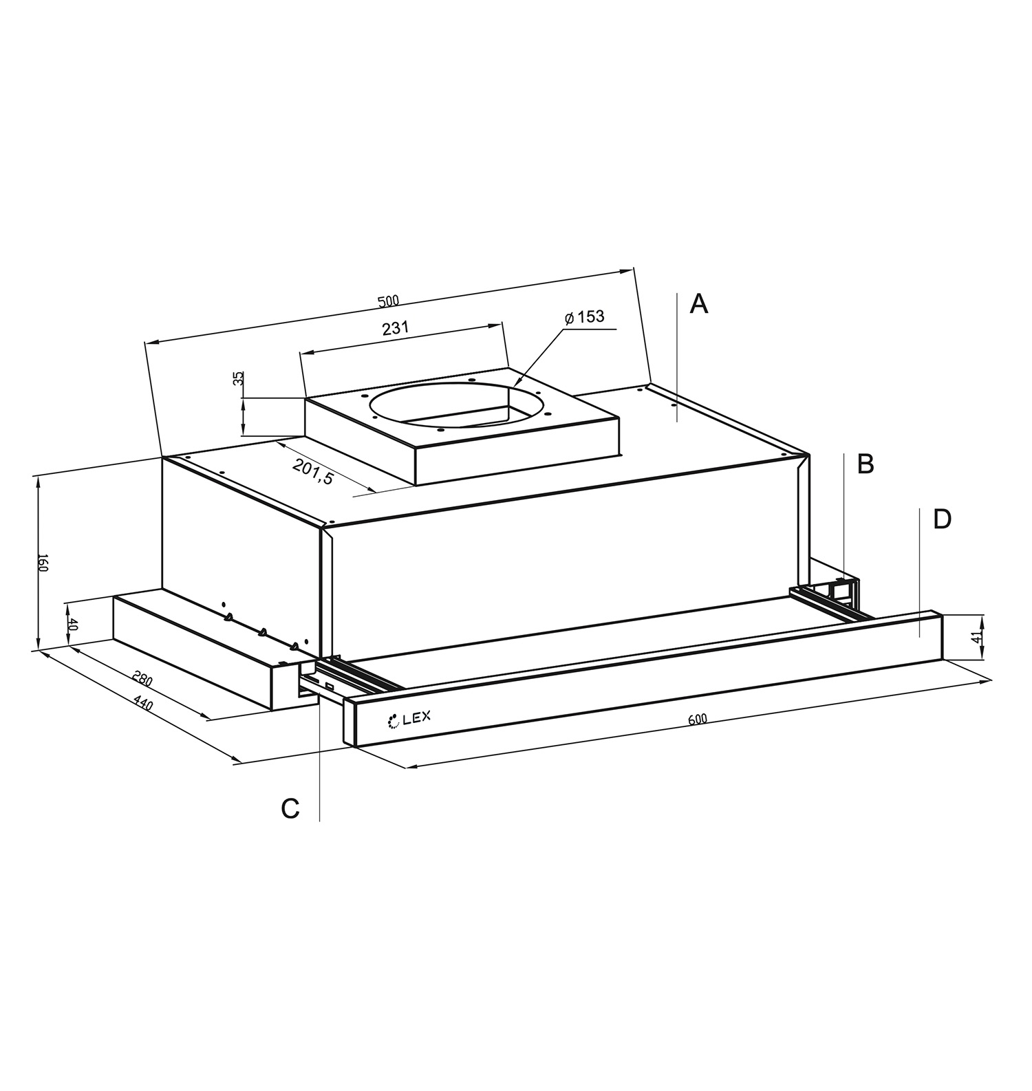 Вытяжка может работать в режиме рециркуляции, поэтому ее можно использовать и в кухне без вентиляционного выхода. Телескопическая конструкция дает возможность сэкономить место без потери производительности. Модель встраивается в кухонный шкафчик, видимой остается только узкая передняя панель, поэтому вытяжку можно установить в любую кухню, независимо от стиля интерьера.