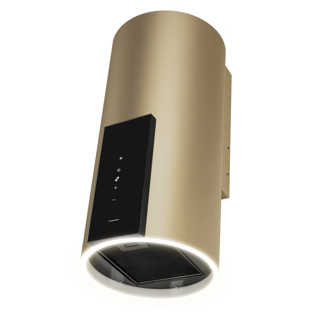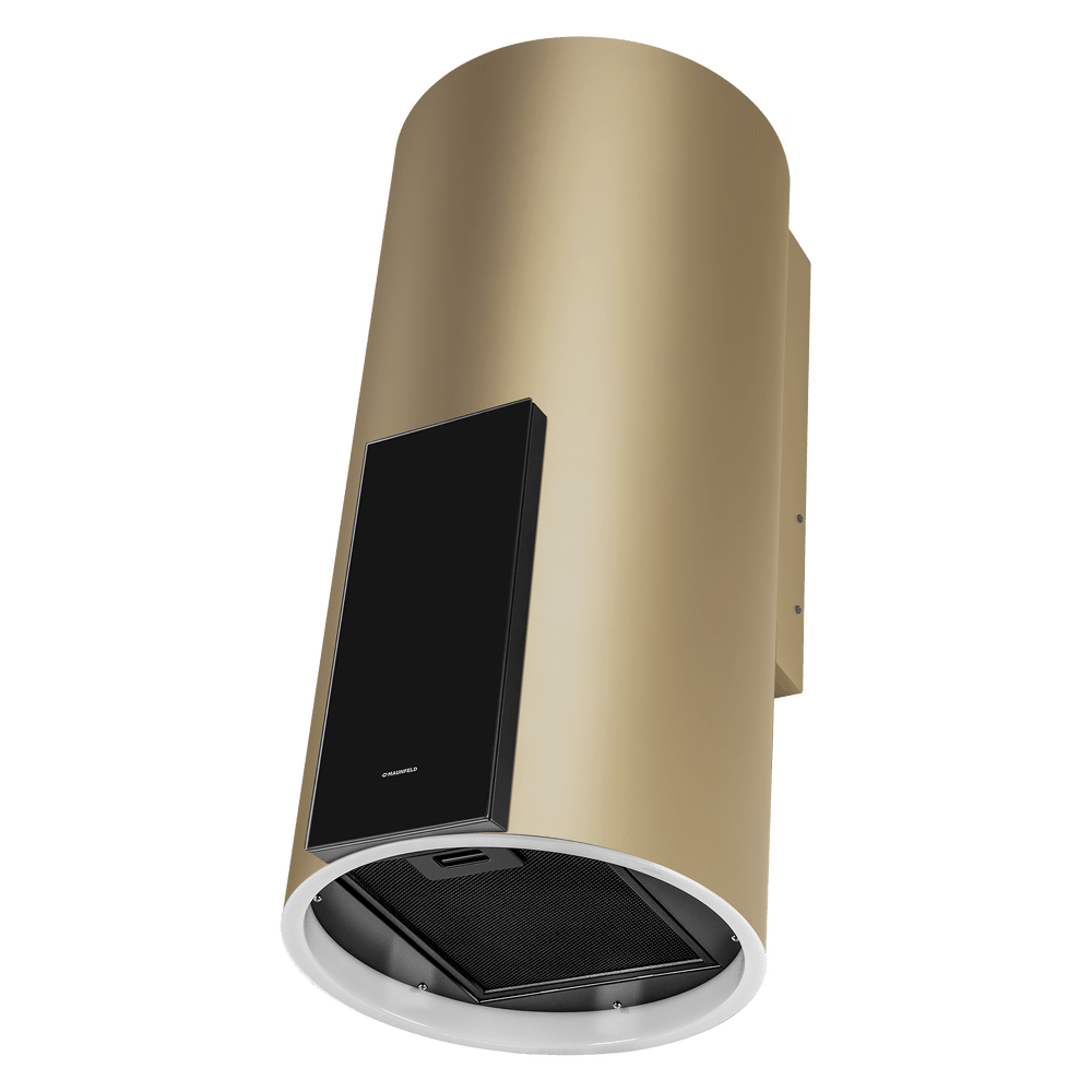 Корпус цилиндрической формы, выполненный из нержавеющей стали с термостойким покрытием, устанавливается на стену над поверхностью плиты. Алюминиевый многослойный жироулавливающий фильтр находится в нижнем торце вытяжки. Сенсорное управление с подсветкой позволит выбрать один из 4-х режимов работы вентилятора и включить подсветку.