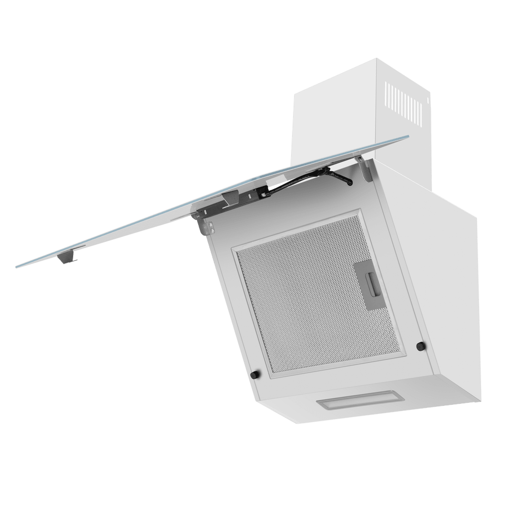Корпус сделан из эмалированной стали. Фасад выполнен полностью из закаленного стекла. За ней скрыт алюминиевый жироулавливающий фильтр, который легко снимается и полностью разбирается для чистки. Загрязненный воздух втягивается по периметру откидной панели.