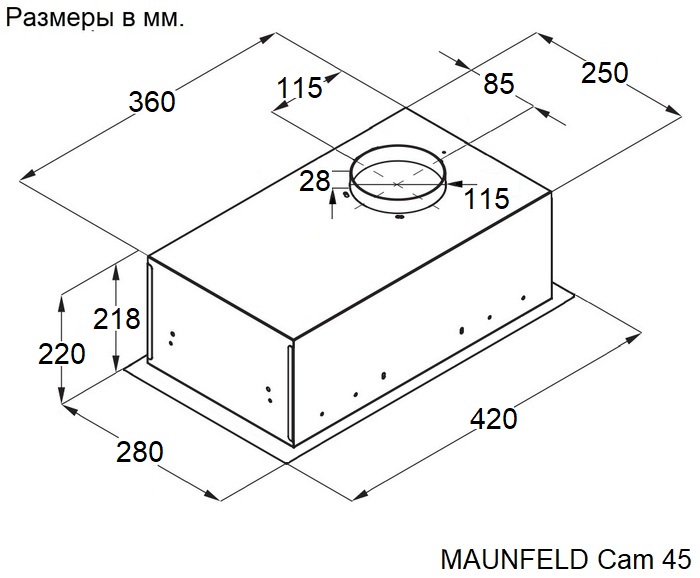 Встраиваемая вытяжка Maunfeld Cam 45 Black — это идеальное решение для современных кухонь, где важны не только функциональность, но и эстетика. Прямоугольная форма обеспечивает компактность и удобство установки в кухонный шкаф. Высота модели составляет 22 см, ширина — 42 см, а глубина — 28 см, что делает ее подходящей для небольших пространств.