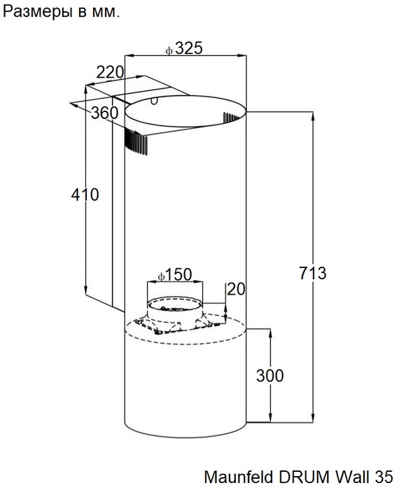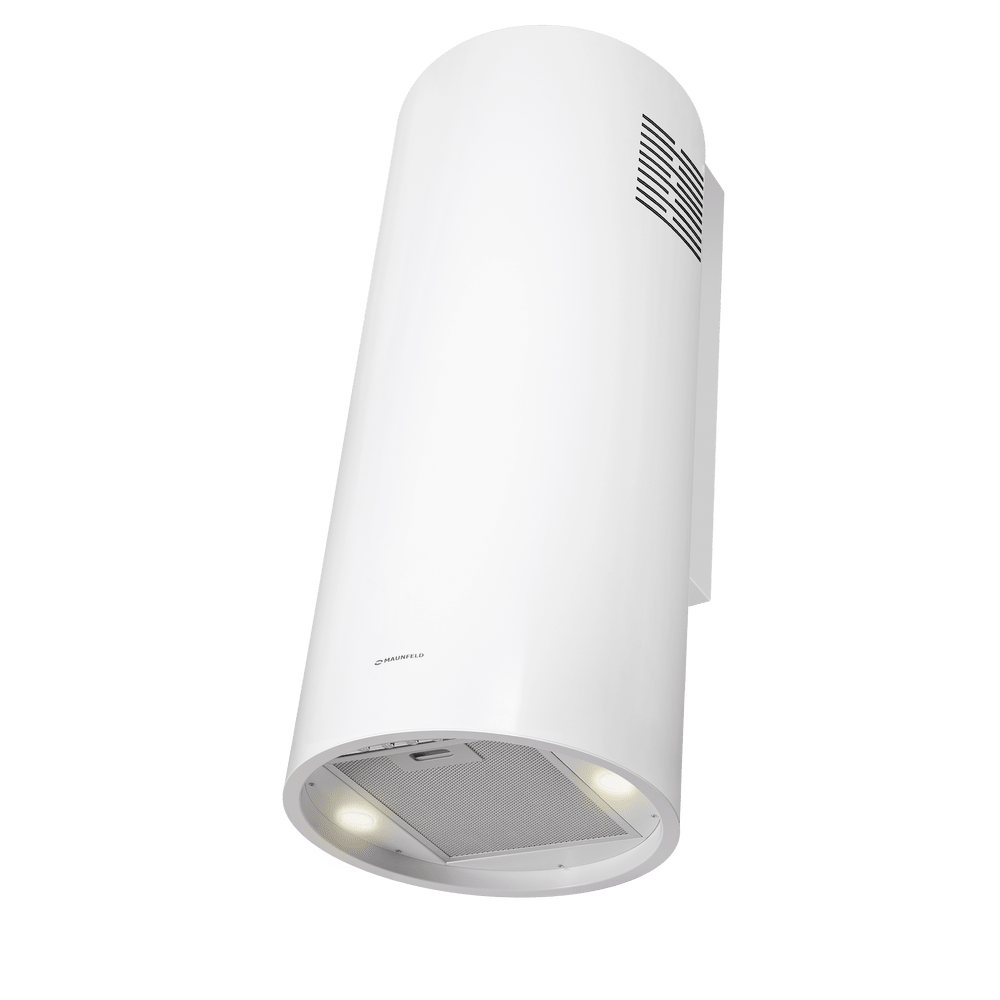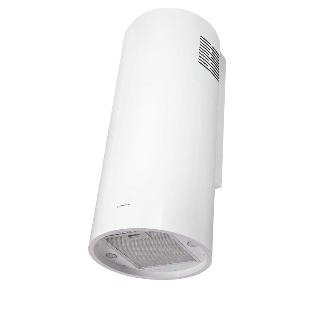 Корпус цилиндрической формы, выполненный из нержавеющей стали с термостойким покрытием черного цвета, устанавливается на стену над поверхностью плиты. Алюминиевый многослойный жироулавливающий фильтр находится в нижнем торце вытяжки.