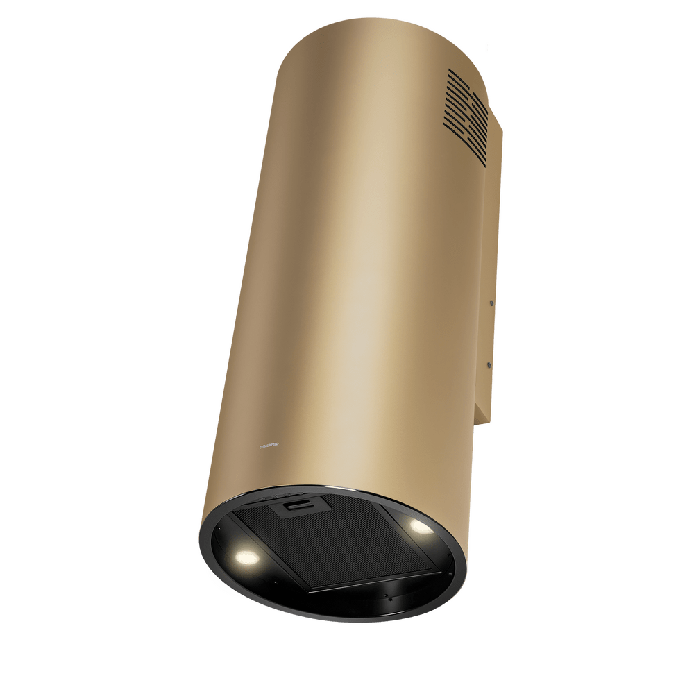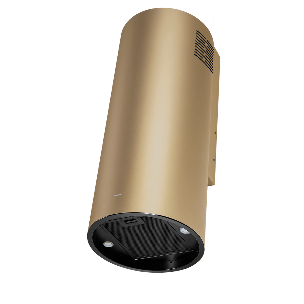 Корпус цилиндрической формы, выполненный из нержавеющей стали с термостойким покрытием черного цвета, устанавливается на стену над поверхностью плиты. Алюминиевый многослойный жироулавливающий фильтр находится в нижнем торце вытяжки.