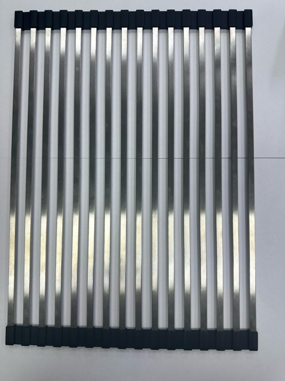 Стильные коврики расстилаются на крыле мойки или на столешнице. Увеличивают пространство для сушки. Можно использовать для размещения горячих кастрюль и сковородок. Ролл-мат закрывает всю чашу мойки, тем самым обеспечивая дополнительное удобство в работе. Легко сворачивается в компактный рулон и занимает мало места при хранении. Материал: нержавеющая сталь PVD, черный силикон.
