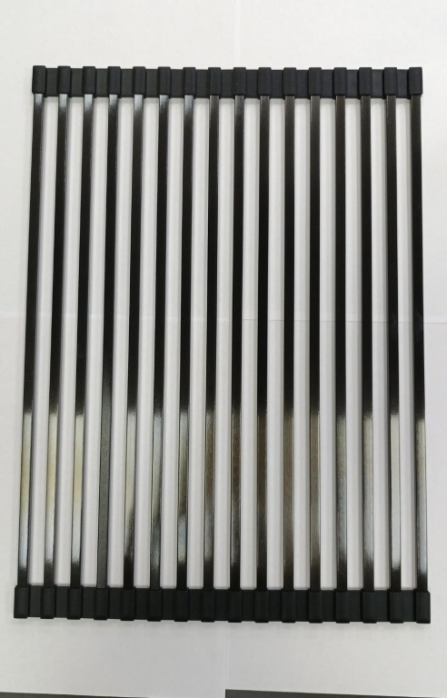 Стильные коврики расстилаются на крыле мойки или на столешнице. Увеличивают пространство для сушки. Можно использовать для размещения горячих кастрюль и сковородок. Ролл-мат закрывает всю чашу мойки, тем самым обеспечивая дополнительное удобство в работе. Легко сворачивается в компактный рулон и занимает мало места при хранении. Материал: нержавеющая сталь PVD, черный силикон.