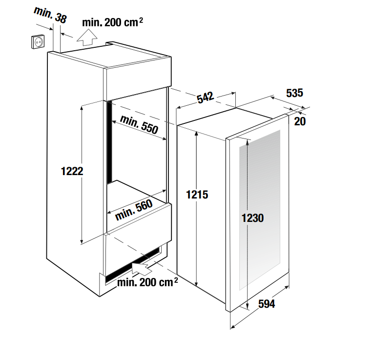 Размеры ниши для встраивания,мм 1222х560х550