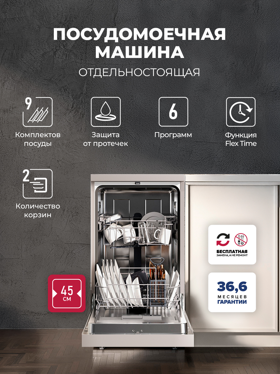 Устройство не требует подачи горячей воды, нагрев происходит внутри него. Это важное преимущество, поскольку холодная водопроводная вода чище и ее не отключают в летнее время. Посудомоечная машина оснащена системой AquaBlock, которая поможет избежать протечек, и функцией отложенного старта до 24 часов, благодаря чему посуду можно мыть даже ночью. Кроме того, модель работает тихо, поэтому вам не придется переживать о том, что шум потревожит чей-то сон.