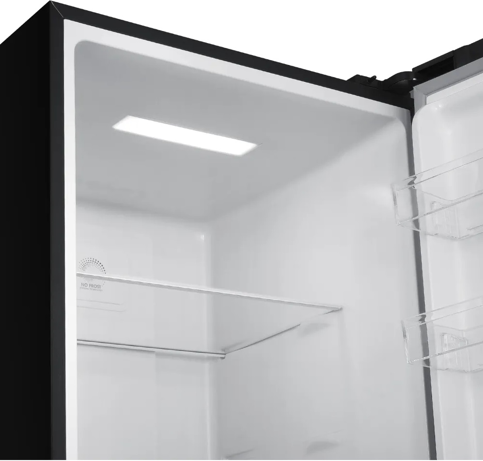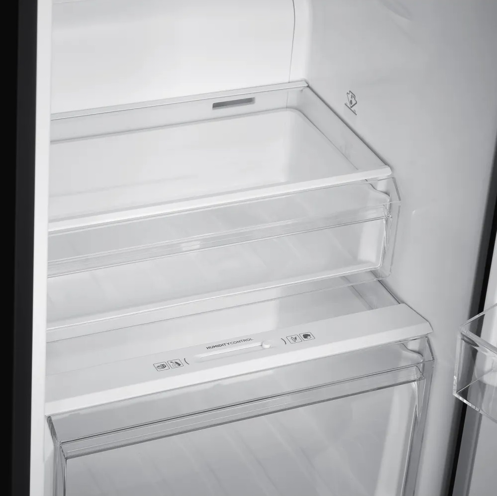 Внутри холодильника предусмотрено 4 полки из стекла, 3 из которых регулируемые, и 4 полки на дверце. Также есть 2 ящика для овощей и фруктов и зона свежести для хранения продуктов, которые требуют особого режима. Освещение обеспечивают светодиодные лампы, которые обеспечивают равномерное и яркое освещение.