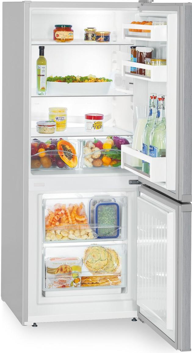 Холодильная камера обладает полезным объемом 156 литров и оснащена тремя полками из закаленного стекла, две из которых можно регулировать по высоте. В холодильнике также есть два контейнера для фруктов и овощей, три полки на дверце из пластика, подставка для яиц и отделения для консервов и бутылок.